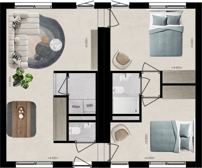 - Appartement 2: Ruim appartement met aparte badkamer en toilet, inclusief standaardblok voor keuken en technische ruimte. Voorzien van twee slaapkamers en een woonkamer.