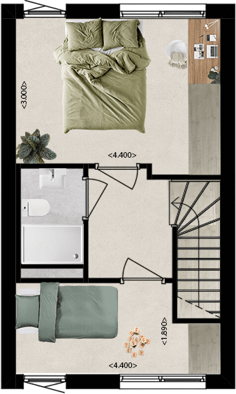 - Appartemnet 3: Appartement over twee verdiepingen met woongedeelte beneden, inclusief standaardblok voor keuken, toilet en technische ruimte. Boven bevinden zich twee slaapkamers en een badkamerblok.