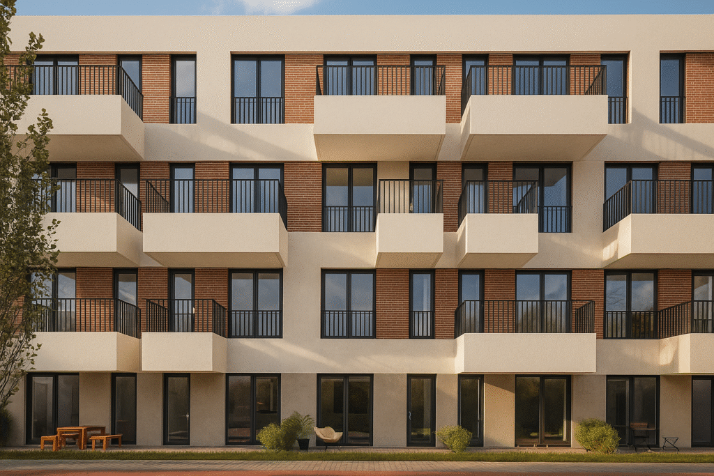 - Appartement 3: Appartement over twee verdiepingen met woongedeelte beneden, inclusief standaardblok voor keuken, toilet en technische ruimte. Boven bevinden zich twee slaapkamers en een badkamerblok.